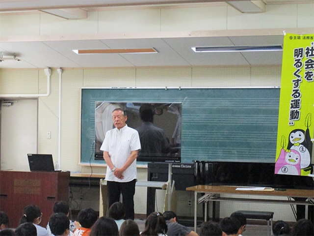 社会を明るくする運動について、説明している千葉 富士男青葉区推進委員会委員長。児童は社会を明るくする運動について初耳の様子。真剣に説明を聞いていました。