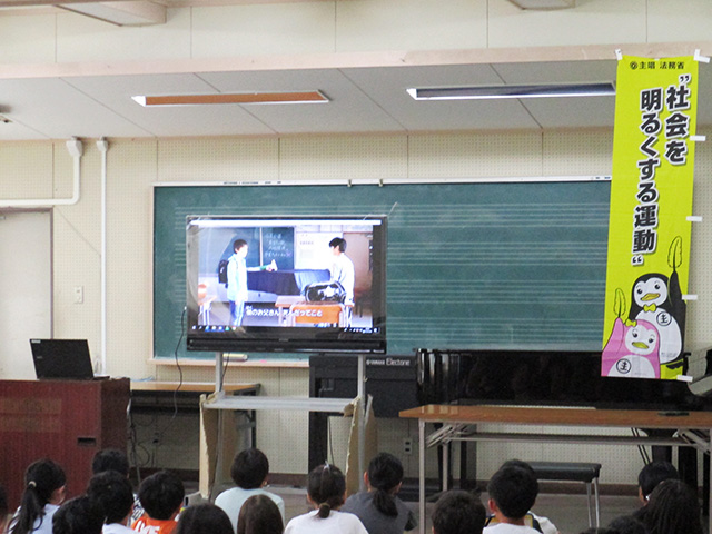 社会を明るくする運動理解啓発用DVDを集中して鑑賞する児童。いじめについては、身近な問題であり、映像を用いての授業は、児童の皆さんにわかりやすい内容になりました。